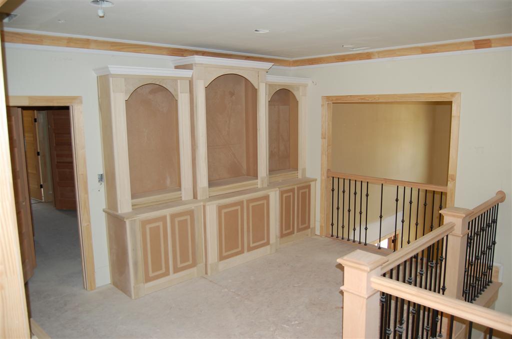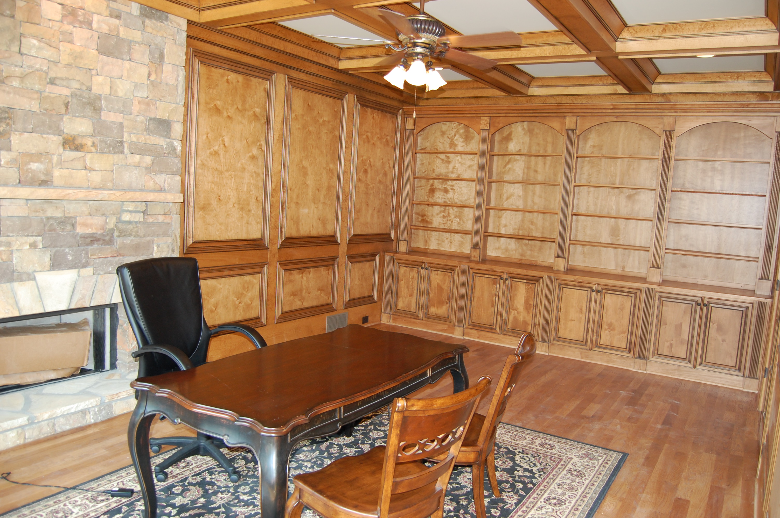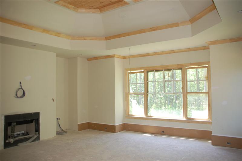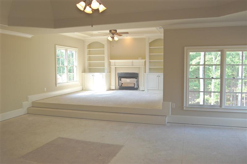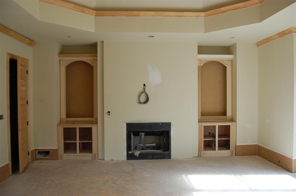 Suite with trey ceiling, fireplace, custom bookcases and a wall of